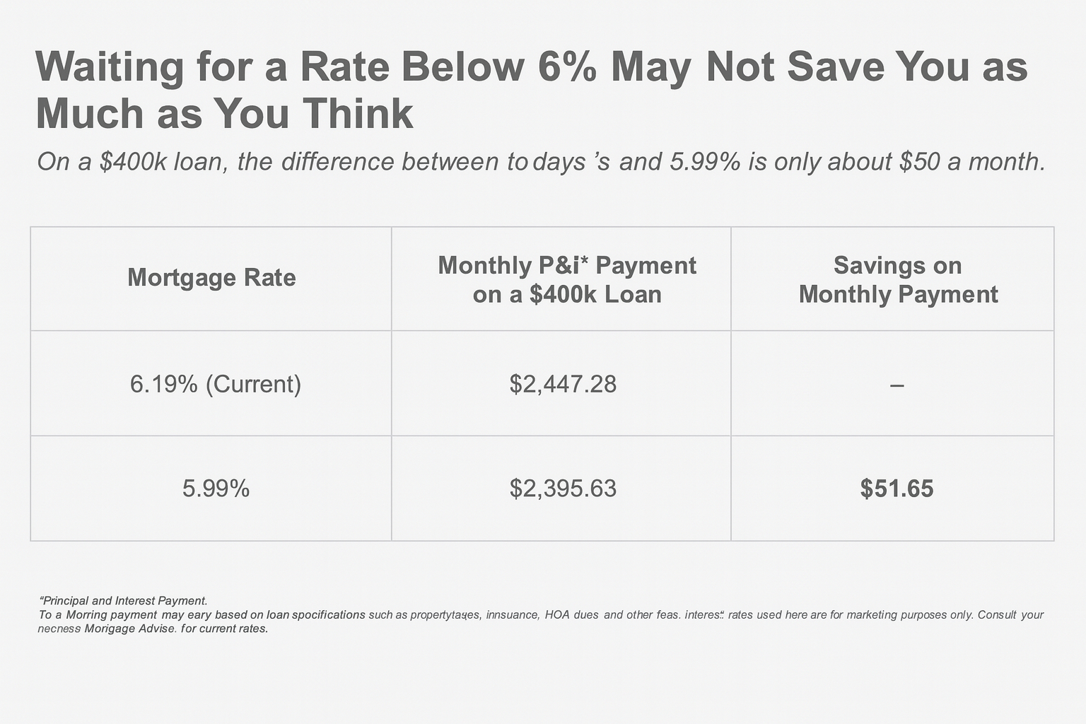 On a $400,000 mortgage, the difference between today’s rate (around 6.2%) and 5.99% is roughly $50 a month. That’s less than many people spend on weekly coffee runs or occasional DoorDash orders. And as prices tick up with more buyers in the market, that could quickly negate any of your potential savings.