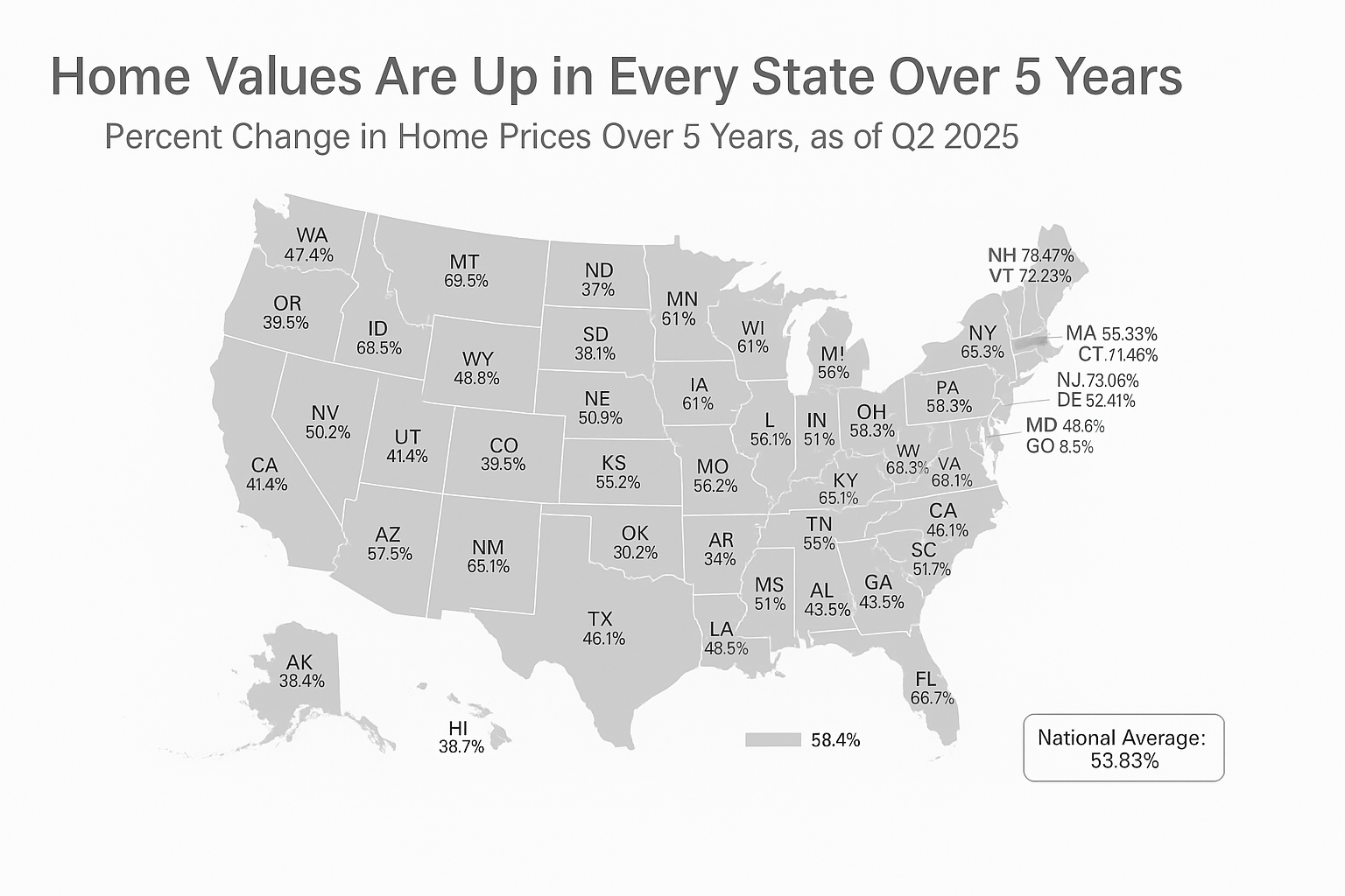 Data from the Federal Housing Finance Agency (FHFA) helps paint this picture. Let’s cast a slightly wider net and look at a state-by-state level this time. Every single state has seen prices go up over the last 5 years. And that means homeowners in each state have much more equity than they did just 5 years ago (see graph below):